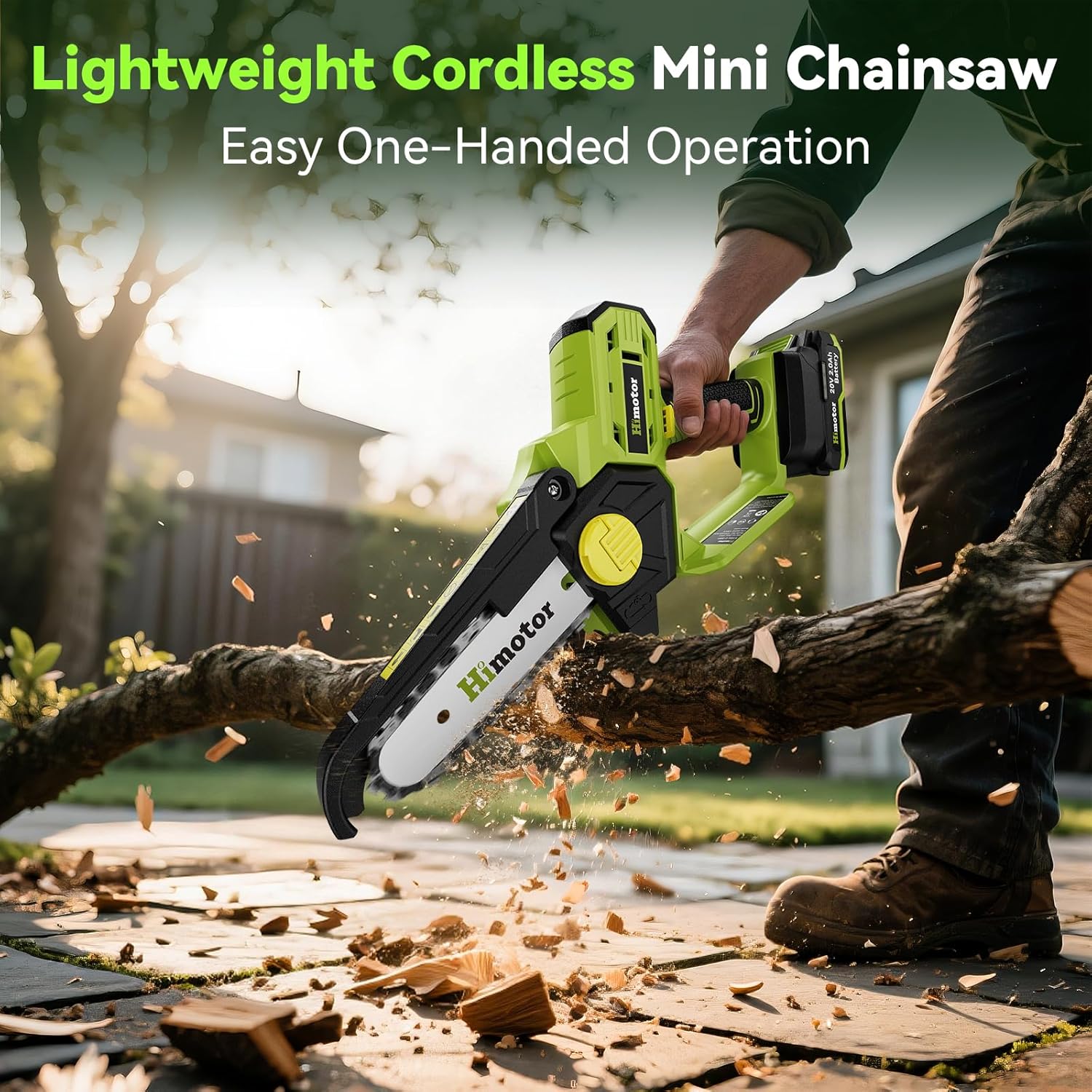 | Included Components | 1x Cordless Mini Chainsaw, 2x 20V 2000mAh Batteries, 2x Premium Chains (1 pre-installed), 1x Guide Bar, 1x Guide Bar Cover, 1x Fast Charger (FCC-certified), 1x Screwdriver, 1x Cleaning Brush, 1x Empty Oil Bottle, 1x Safety Gloves, 1x Safety Goggles, 1x User Manual |